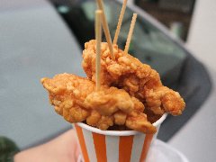 ![]() | 東武日光駅から中禅寺湖方面に2.2kmほど、国道120号沿いにあります。かなり殺風景な外観で看板も出ていません。その代わりに「那須どりからあげ」の垂れ幕が出ていました。店内にはショーケースがありますが、ほとんど何も入っていませんでした。那須どりからあげ(400円)を買いました。注文してから揚げます。カップに入れて提供されます。大きめのから揚げが5つ入っていました。揚げ立てで熱々、軟らかくてジューシーでした。割りと濃いめの下味が付いていました。美味しかったです。他には、メンチカツがありました。なのでメニューは2つのみです。精肉は見えませんが売っているのでしょうか? |