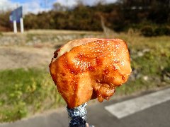 ![]() | 上毛高原駅から1.1km、県道61号の下牧の交差点の近くにあります。平屋の建物です。赤い看板です。平日ですが開店からお客がちらほらいました。店内は小ぢんまり、テイクアウトのみでレジカウンターがあります。注文すると奥から出してくれます。蒸焼き(320円)、テリ焼き(400円)を買いました。大きさによって値段が違います。蒸焼きは骨付き、1本だとモモかムネを選びます。温かかく柔らかくて歯応えもあります。やや甘めの味がついています。割りと小骨がありました。テリ焼きは肉厚で食べ応えありました。国産で生後50日以内の若鶏のみを使用しているそうです。美味しかったです。美味しかったです。他には、丸焼き、たまに串焼きがあるようです。 |