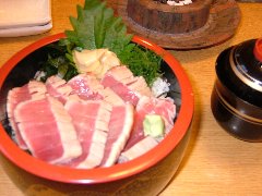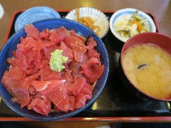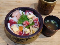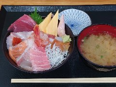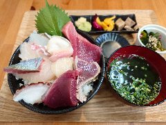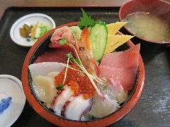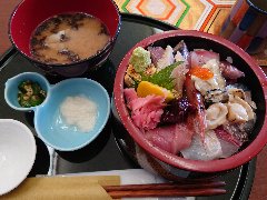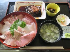 ![]() | 勝浦駅から10分ほど、仲本町朝市通りの突き当りにあります。2階建ての建物です。半分は元魚屋でもう半分が食堂になっています。お店の前に看板おばちゃんが座っていました。店内は、テーブルが3つ、小ぢんまりしていました。奥の厨房は魚屋の作業場のような感じでした。海鮮丼(2000円)を注文しました。お吸い物、酢の物、鰹の煮物、漬物が付きます。鰹(刺身、たたき)、たこ、貝(ホッキみたい)、ほたて、カンパチ、鯛、白身、鮪(中トロ、赤身)などが乗っていました。刺身は新鮮でけっこう厚めです。食べ応えありました。美味しかったです。ちょっと高いかも。他には、刺身定食、鉄火丼、さざえのかき揚げ、文化鯖定食などがありました。 |