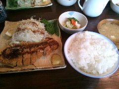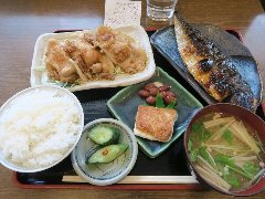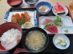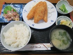 ![]() | 二宮駅南口から西に7分ほど、国道1号沿い、梅沢の交差点の近くにあります。薄いピンク色のビルの1階です。店内は、テーブルが5つありました。小ぢんまりしています。メニューが壁に貼ってあります。素朴な雰囲気です。お好み組合せ定食(1100円)を注文しました。780円以下の11種類の定食から2つ選べます。さしみもり合せともり合せフライにしました。定食には、ご飯、味噌汁、漬物、豆腐、刺身、魚のフライ、スイカが付いていました。刺身は、マグロ、カンパチ、サバでした。フライはムツと太刀魚でした。美味しかったです。いろいろ組み合わせることが出来ていいです。他には、さばみそ煮定食、かき揚げ定食、とんかつ定食などがありました。 |