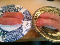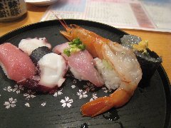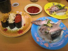 森田水産回転寿司 | 和食 | 茨城県ひたちなか市湊本町 | ★★ (2012.10.7) | 普通 | ![]() | 那珂湊漁港に面して観光市場が並びます。その1つである森田水産の店の奥にある回転寿司屋です。回転寿司ですが回転している寿司を取る客はほとんどいなくて、店員に注文しています。北海三色盛(630円)(上ウニ、いくら、カニのほぐし身)、光三種盛(420円)(鯵、秋刀魚、コハダ)などいろいろ食べました。上ウニは軍艦にたっぷりのウニがのっています。鯵も大きかったです。さすがにネタは新鮮、大きいです。美味しいです。値段は安いものは安いですね。2階にも回転寿司があります。 |