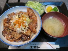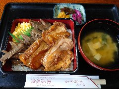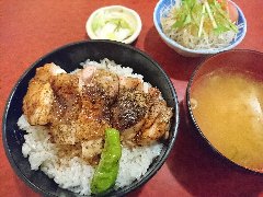 ![]() | 下仁田駅から3分ほど、中央通りを進んでちょっと曲がるとあります。この辺りのお店に比べて派手な外観です。店内は、テーブルが2つ、座敷にテーブルが4つありました。ジオパーク丼(850円)を注文しました。サラダ、味噌汁、漬物が付きます。ジオパーク丼は、ご飯の中に刻み海苔、豚バラ、刻みネギ、白ごま、七味などが乗っていました。海苔や豚バラで地層を表現しているそうです。バラ丼のメニューもあり何が違うのか聞いてみたところ、海苔があるかないかだそうです。豚バラは焼き目が香ばしく甘辛いでタレ、適度な脂身で柔らかいです。美味しかったです。料理では無いですが、お冷も美味しかったです。他には、下仁田かつ丼、焼肉丼、各種ラーメン、焼肉などもありました。 |