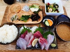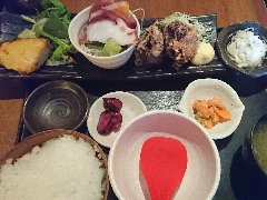 OHASHI | 和食/居酒屋 | 神奈川県小田原市栄町 | ★ (2017.3.8) | 普通 | ![]() | 小田原駅東口から2、3分、錦通り入口交差点の近く、ビルの2階にあります。店内は、テーブルが多数と堀コタツの座敷がありました。窓から遠い席は薄暗いです。ランチメニューから、プレートランチ(1050円)を注文しました。刺身(マグロ、たこ、サーモンなど)、唐揚げ、焼魚(サワラの西京焼き)、サラダ、小鉢、漬物、ご飯、味噌汁が付きます。ご飯はお櫃に入っていました。おかずがいろいろあって楽しくて美味しいです。相模湾の魚や地元の契約農家の野菜を使っているそうです。他には、金目の干物定食、マグロカマ焼き定食、サバの塩麹焼き定食などがありました。夜は炉端焼きの居酒屋です。 |