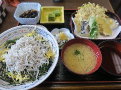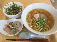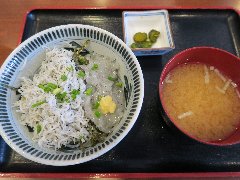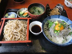 ![]() | 衣笠ICから9km強、国道134号沿い、林の交差点から葉山方面に3kmほどの所にあります。割りと大きな建物です。店内は、テーブルが3つ、大テーブルが1つ、座敷もありました。天井が高く梁が見えています。生しらす丼そば付(1320円)とアカモクを注文しました。生しらす丼、もりそば、味噌汁、小鉢、漬物が付きます。生しらすは地元で獲れたものだそうです。黄身を混ぜるとねっとりと濃厚になりました。アカモクは海藻、細かく刻まれていました。ネバネバしますが葉っぱのように薄いのでちょっと変わった食感でした。どちらも美味しかったです。他には、各種そば、各種丼、まぐろ刺身定食、釜あげしらす丼などがありました。 |