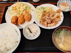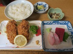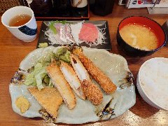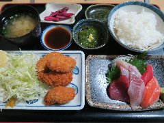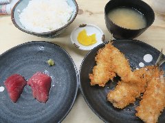 ![]() | 阪東橋駅から5、6分、よこはまばし商店街にあります。3階建ての1階です。派手めの外観です。店内は、カウンター席が8つ、テーブルが4つありました。居酒屋のランチです。ミックスフライ定食(1300円)を注文しました。フライは、イカ、カキ、エビ、アジでした。揚げ立てでホクホクです。刺身も付きます。刺身はマグロ、イカ、アジでぷりぷり新鮮、特にイカは柔らかく歯応えがよかったです。フライと刺身が一緒に食べられるのは嬉しいです。美味しかったです。他には、刺身定食、お刺身六種丼、カキフライ定食などがありました。 |