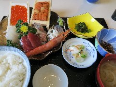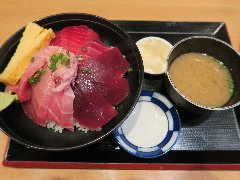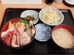 ![]() | 神奈川駅から1.1kmほど、横浜市中央卸売市場本場水産物部の中にあります。外のガラス面にはメニューがいっぱい貼られていました。店内は、カウンター席が4つ、大テーブルが1つ、テーブルが1つありました。市場の食堂の雰囲気です。海鮮丼(1300円)を注文しました。サラダ、漬物、味噌汁が付きます。マグロ、エビ、イカ、カンパチ、カツオ。ねぎとろ、アジなめろう、しらす、玉子などが乗っていました。丼は小ぶりですが新鮮な刺身がぎっしりでした。美味しかったです。他には、刺身定食、アジ刺身定食、うなぎ丼などがありました。 |