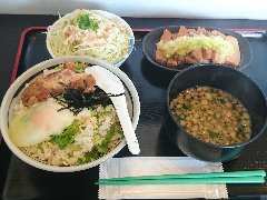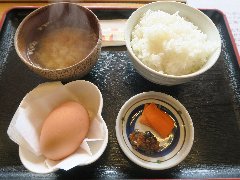 九十九里ファーム | 和食 | 千葉県香取郡多古町喜多大谷台 | ★★ (2016.9.10) | 安い | ![]() | 芝山千代田駅から東に4.5kmほど、国道296号沿いにあります。養鶏場直営の販売所です。サイロと黄色い建物に鶏の看板が目印です。店内は、手前側に卵や野菜が並んだ直売所、奥が食堂になっています。食堂にはテーブルが6つありました。たまごかけご飯(360円)、たまご屋さんプリン(205円)を注文しました。セルフサービスです。たまごかけご飯には、ご飯、味噌汁、鶏ごぼう、玉子焼き、漬物が付きます。卵、ご飯、味噌汁は食べ放題です。醤油は3種類用意されていました。卵も美味しいですが、鶏ごぼうが美味しかったです。お米や味噌も地元産だそうです。いくらでも食べられそうですが、余力を残し卵は3つ頂きました。この内容でこの値段は安いですね。プリンも美味しいです。他には、二色丼、鶏ごぼう丼などがありました。朝9時から営業しています。 |