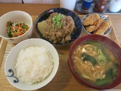 ![]() | ソシオ流通センター駅から西に1.3kmほど、県道128号沿いにあります。2階建ての建物、広い駐車場には世界一のもつ煮と書かれた看板がありました。店内は、テーブルが11ありました。座敷もあります。けっこう広いです。壁にはたくさんのメニュー短冊がありました。街道沿いのザ大衆食堂という雰囲気です。もつ煮ハムカツセット(980円)を注文しました。ご飯、味噌汁、漬物が付きます。もつ煮はモツとこんにゃくと刻みネギが入っていました。モツは味が染みてとても柔らかくまったく臭みがありません。味噌仕立てのスープもいい味わいでした。ハムカツはカラッと揚げられ素朴な味わいでした。美味しかったです。他には、生姜焼肉定食、かつ丼、ラーメンなどがありました。 |