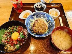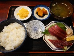 ![]() | 三崎口駅から1分、駅のする近くにあります。3階建ての1階です。ガラス張りの外観です。店内は、カウンター席が6つ、テーブルが6つありました。居酒屋風です。まぐろ三色丼定食(1760円)とまぐろほほ肉フライを注文しました。お吸い物と惣菜が付きます。三色丼は、めばち赤身、インド大トロ、ねぎとろの三色です。大トロはとろとろで間違いなしです。ほほ肉フライは揚げ立てで柔らかく旨味がしっかりしていました。美味しかったです。他には、ねぎろとの城だれユッケ丼、まぐろ山かけ丼などがありました。 |
