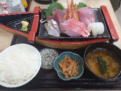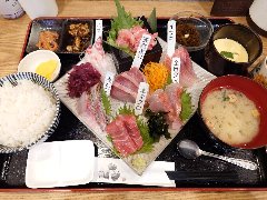 ![]() | 国道駅から4分ほど、生麦魚河岸通り沿いにあります。2階建ての建物です。隣は魚屋のようです。店内は、カウンター席が5つ、小上がりのテーブルが3つありました。カウンターには冷蔵ケースがあります。刺身定食(1500円)を注文しました。必要以上に大きな丸い器に惣菜がちょこっと入っていました、刺身は、中トロ、エビ、クジラベーコン、ホタテ、イワシ、ホタルイカ、赤貝、あん肝などが入っていました。刺身は新鮮でぷりぷり、赤貝はコリコリしていました。ただしちょっと小さいです。美味しかったです。他には、本鮪中トロ丼、海鮮ちらし丼、サバ先焼定食などがありました。 |