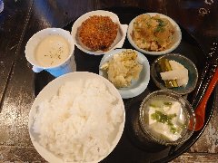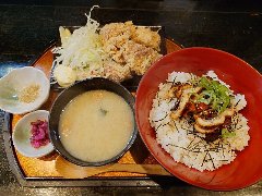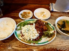 ![]() | 横須賀中央駅から3、4分、バス通りから1本海側の路地にあります。2階建ての建物です。木の引き戸の外観です。店内は、1階にテーブルが5つ、2階にテーブルが5つ、座敷もありました。鶏の竜田揚げ定食(750円)を注文しました。定食には選べる小鉢が2品が付きます。牛モツ煮込みとちしゃとうの西京漬けにしました。唐揚げは白か黒を選べ黒にしました。ご飯の大盛りは無料です。唐揚げ黒はにんにく&醤油です。大きくて皮がパリパリ、にんにくが効いていました。美味しかったです。何気に小鉢のちしゃとうが美味しかったです。そして安いです。他には、鮪&アボカド丼、ロースとんかつ、牛バラ焼き肉などがありました。 |