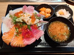 ![]() | 金沢文庫駅東口から1分、すずらん通り商店街にあります。青いテントが目印です。開店前から数名の待ち客がいました。店内は、テーブルが4つ、大テーブルが1つありました。壁はメニューだらけです。まさに市場食堂という雰囲気ですが、魚市場ではありません。魚介の卸問屋の直営なのだそうです。お客の年齢層は高めです。混んでるのでほぼ相席です。市場ちらし丼(1200円)を注文しました。味噌汁と漬物が付きます。マグロ(赤身、中トロ)、タコ、イカ、ホタテ、イクラ、エビ(生、蒸し)、鯛、玉子焼きが入っていました。どれも新鮮で美味しかったです。他には、市場スペシャル定食、穴子天丼、アジフライセット、おまかせにぎり寿司などメニューは豊富です。人気があります。 |