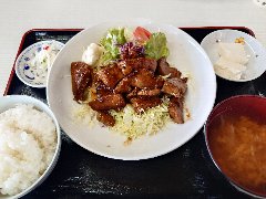 ![]() | 大前駅から7.5kmほど、国道406号の新田代橋の交差点から路地に入ったところにあります。平屋の建物です。レトロな外観です。店内は、大テーブルが1つ、座敷にテーブルが多数ありました。田舎の食堂と言った雰囲気です。焼肉定食(880円)と牛もつ(660円)を注文しました。ご飯、味噌汁、キャベツの漬物が付きます。豚肉のロースはボリュームたっぷり、甘辛ダレでご飯が進みます。牛もつは味噌仕立て、いろいろな部位が入っていて歯応えがいいです。キャベツの漬物もいいです。美味しかったです。ちょっと肉ばかり食べ過ぎました。他には、鶏唐揚げ定食、豚カツ丼、カレーなどがありました。 |
