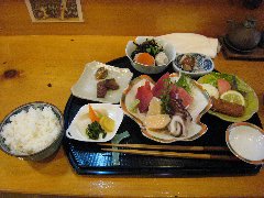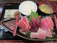 くろば亭 | 和食 | 神奈川県三浦市三崎 | ★ (2017.12.2) | 普通 | ![]() | 三崎口駅から5km強、三崎港の近くの日の出交差点の近くあります。手作り風のテントが目印です。お店の外でマグロを裁いていました。店内は、カウンター席が10、座敷にテーブルが多数ありました。居酒屋風です。店員さんが詳しくメニューの説明をしてくれます。まぐろ刺身定食(2160円)、まぐまぐの実(500円)などを注文しました。刺身は、中トロ、赤身、ビントロなどが入っていました。中トロ、赤身が美味しいです。まぐまぐの実は、マグロミンチとウズラの卵が入った揚げ物です。マグロ版スコッチエッグのような感じです。他には、カブト焼き、血合のカルビ焼き、マグロの珍味などマグロのメニューは豊富です、近海ものの刺身もありました。 |