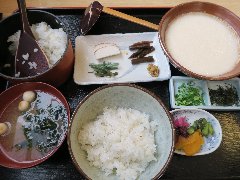 とろろ汁専門店 | 和食 | 神奈川県足柄下郡箱根町箱根 | ★ (2016.11.12) | 小高 | ![]() | 国道1号沿い、箱根関所南の交差点の近く、箱根ホテルの近くにあります。芦ノ湖までは1分、お土産屋の2階です。とろろ汁の専門店です。店内は、テーブル席が多数、座敷もあります。むぎとろ御膳(1296円)を注文しました。とろろ汁、麦ご飯、付け合せ(かまぼこ、きゃらぶきなど)、薬味(刻み海苔、青ネギ)、漬物、味噌汁が付きます。とろろ汁は生味噌を使った出汁で伸ばしているそうです。ご飯は軽く2杯分くらいです。さらさらしているのであっという間に平らげました。他には、むぎとろ御膳に付加する形で梅肉、明太子、なめ茸、わさび漬、それぞれの御膳、ワカサギの寒露煮などがありました。この値段だと内容がちょっと寂しいかな。 |