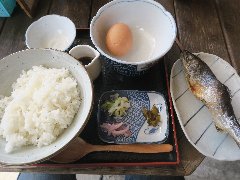三峰お犬茶屋 山麓亭 | 和食/蕎麦 | 埼玉県秩父市三峰 | ★ (2017.6.17) | 普通 | ![]() | 奥秩父、三峯神社の参道にあります。秩父の中心部からは35kmもある山奥です。お犬とは三峯神社で祀られる狼の事です。3階建ての大きな建物です。お店の前は開けていて奥秩父の山々が見えます。お店の外で、いもでんがくとやまめが炭火で焼かれていました。店内はテーブル席が多数、小上がり、外にもテーブルがあります。蕎麦といもでんがくが名物のようですが、蕎麦もいもでんがくも売り切れでした・・・。玉子かけごはん(500円)、やまめ炭火焼(600円)を注文しました。秩父の彩美卵、ご飯、漬物が付きます。TKGもやまめも間違いの無い美味しさでした。他には、蕎麦、とろろめし、けんちん汁、おしるこなどがありました。 |