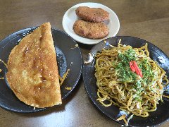 やきそば&ふらい | 郷土 | 埼玉県行田市城南 | ★ (2018.3.31) | 普通 | ![]() | 行田市駅南口から1.4km、水城公園の西側にあります。緑色のテントとフライのノボリが目印です。ときわ肉店の隣にありますが、肉屋はもう営業していないような感じでした。店内は、細い通路の先に部屋があります。通路の途中にレンジカウンターがあり注文します。部屋には、テーブルが1つ、小あがりにテーブルが2つありました。何とも素朴な雰囲気です。本棚には漫画やかなり古いバイク雑誌が置いてありました。ふらい(ソース・小)(300円)、焼きそば(ソース・小)(300円)、ゼリーフライ(100円)を注文しました。期せずして全部同じ色になりました(笑)。素朴で美味しかったです。小でもまあまあの量あります。他には、とり皮味付、メンチ、ハムカツなどがありました。ゼリーフライのチョコバナナ?ってのもありました。300円で1枚のサービス券、10枚で200円相当になります。 |
