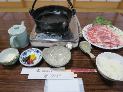 ![]() | 下仁田駅から2、3分、中央通りの1本隣の狭い路地にあります。店名からは想像つきませんがすき焼き屋です。孤独な番組で紹介された人気店です。店内は、和風の広い座敷にテーブルが13ありました。ステージもありました。テーブルには予めコンロと鍋が置いてありました。豚すき焼き(1300円)を注文しました。大皿に、下仁田ポーク、長ネギ、えのき、しらたき、豆腐、春菊が入っていました。ご飯、漬物、卵が付きます。1人すき焼きです。すき焼きは自分で作ります。店員さんが作り方を教えてくれます。豚もネギも柔らかく、とても美味しかったです。そして安くてボリュームもあります。下仁田ネギが旬の時期には長ネギは下仁田ネギになるようです。他には、上州牛すき焼き、餃子などがありました。料理が上手い人が作ればもっと美味しくなりそうです。 |