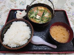 ![]() | 笠間駅から6.6kmほど、県道61号沿いにあります。市街地からは離れた場所で近くには田んぼや畑が広がります。平屋の建物、街道沿いの定食屋です。営業中と書かれた板が横になっていました。店内は、テーブルが3つ、座敷は広いです。レトロで雰囲気はいいです。メニューはとても多いです。もつ鍋定食(800円)を注文しました。ご飯、味噌汁、漬物が付きます。ご飯多めです。もつ鍋には、もつ、ニラ、豆腐。人参などが入っていました。熱々で具だくさん、もつは柔らかいです。味噌仕立てで塩分はやや高めでご飯が進みます。美味しかったです。他には、とんかつ、肉みそ炒め、スタミナラーメン、カレーライスなどがありました。店員さんはいい感じです。朝6時から営業しています。 |