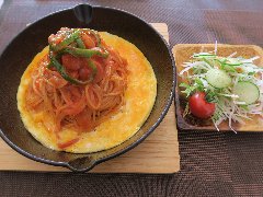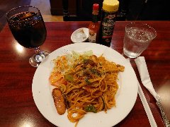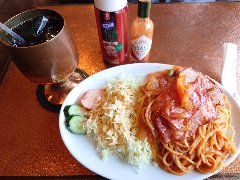 チャオ | 洋食 | 愛知県豊橋市小路 | ★★ (2013.2.13) | 普通 | ![]() | 豊橋駅東口のすぐ近くにあります。2階にある店内はテーブル席が行くともあり意外と広いです。あんかけスパゲティが名物のお店で、どのテーブルでも皆スパゲティを食べています。ランチメニューのバイキング(989円)を食べました。ランチにはサラダとドリンクが付きます。バイキングはあんかけスパゲティの1つで、鉄板の上にあんかけスパゲティと薄い卵焼き、その上にチキンカツとウインナーが乗ります。スパゲティは太いです。あんかけのソースはトマトベースでちょっとピリっとします。食べたことのない味でしたが美味しいです。ボリュームあります。 |