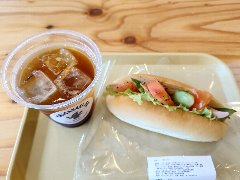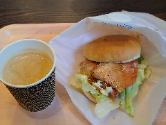 ![]() | 会津下郷駅の駅舎の中、待合室に入口があります。店内は、テーブルが4つありました。レのベーションされ明るくてきれいです。天井が高く広々していました。ますバーガー(550円)とコーラ(セットで200円)を注文しました。ますバーガーは細長い形、バンズにはじゅうねん(えごま)が入っています。ニジマスのフライとトマト、レタスがサンドされていました。マスのフライは揚げ立て、マスは下郷町で養殖されているそうです。柔らく揚がりマスの風味があってクセはありません。美味しかったです。他には、各種ドリンク、ますカレー、ナポリタンなどがありました。 |