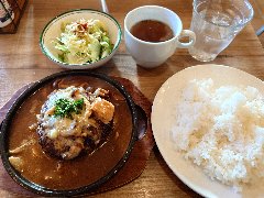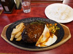 ![]() | 入山瀬駅から10分ほど、県道414号の峯畑の交差点の近くにあります。静岡県内に展開する大人気のチェーン店です。ファミレス風の外観です。けっこう待ち客がいました。機械で予約するのですが、出てくる紙に目安案内時間が20分後と書かれていました。待ち時間はほぼぴったりでした。店内は、テーブルは多数、まさにファミレス風です。げんこつハンバーグ(1058円)を注文しました。オニオンソースにしました。鉄板に乗った焼き目が入った俵型のハンバーグを、その場で店員さんが切ってソースを掛けます。ハンバーグは250g、牛肉100%だそうです。間違いのない美味さでした。他には、焼き野菜カレー、さわやかステーキ、炭焼きバーガーなどがありました。一番の驚いたのは目安案内時間がぴったりだった事です。 |