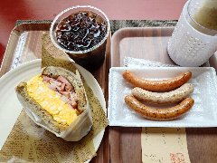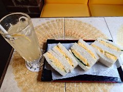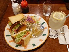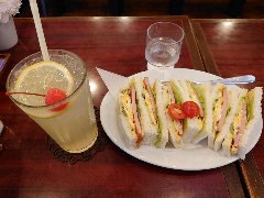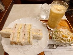 ![]() | 堺筋本町駅から1分、船場センタービル3号館の地下2階の地下街にあります。外にメニューサンプルがあり味がある外観です。店内は、テーブルが多数ありました。セピア色の内装で昭和レトロ感が満載です。サンドウィッチセットとミックスジュース(セットで1050円)を注文しました。サンドイッチは、ハムと玉子の2種類、ちょっと変わった並べ方です。小さめに切られパクパクいけます。ミックスジュースはバナナがメイン?少し酸味がありました。疲れた体に良さそうです。美味しかったです。他には、各種ドリンク、エビピラフ、ミートスパゲティ、オムライスなどがありました。のんびり出来ました。 |