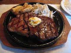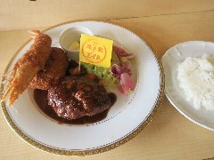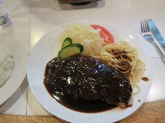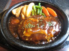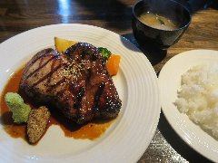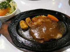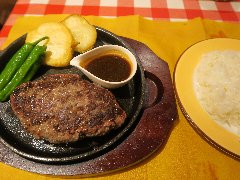 飛行船 | 洋食 | 山形県米沢市城西 | ★ (2014.4.27) | 普通 | ![]() | 駅で言えば西米沢駅、上杉神社の西、国道121号沿いにあります。薄い緑色の結構大きな建物です。店内はボックスのテーブル席が多数ありかなり広いです。名物の米沢牛ハンバーガーはバンズが品切れだそうで終わってました。仕方なくでは無いですが、米沢牛100%ハンバーグステーキ(180g)(1512円)+ライス(194円)を食べました。ソースはチーズのせデミグラス、和風おろしから選びます。デミグラスにしました。ハンバーグは熱々の鉄板で出されます。ソースが甘かったです。和風おろしが正解かもしれません、何となく店の活気がないなと感じました。 |