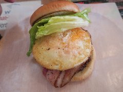 ![]() | 佐世保中央駅から2分ほど、国道35号の本島町の交差点の少し西にあります。紅白のテントが目立っています。ベーコンエッグバーガーの元祖のお店です。予約をして外で少し待ちました。店内は、カウンター席が2つ、テーブルが3つありました。思った以上に狭いです。ベーコンエッグバーガー(702円)を注文しました。バンズに、トマト、レタス、玉ねぎ、ベーコン、マヨネーズ、玉子、ケチャップ、パテがサンドされていました。バンズ、ベーコン、パテ、ケチャップなどは自家製だそうです。美味しかったです。他には、スペシャルバーガー、極撰バーガー、通バーガー、サンドウィッチなどがありました。人気の店です。 |