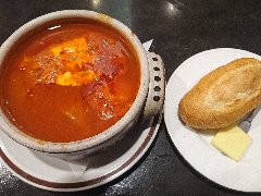 ![]() | 別府大学駅から1.2kmほど、国道500号の日豊本線の踏切辺りからちょっと南に行ったところにあります。馬家溝はまちゃこと読みます。中国の地名?だそうです。夜は看板の文字が光ってました。店内は、テーブルが多数ありました。割りと広いです。大きな柱時計があったり落ち着いた雰囲気です。ミニサラダとボルシチのセット(1630円)を注文しました。フランスパンが付きます。サラダはたくさんの野菜とゆで卵で山盛りでした。ボルシチは、生クリーム、キャベツ、玉ねぎ、ジャガイモ、ニンジン、牛肉が入っていました。野菜や牛肉はとても柔らかく、トマトの酸味と甘みとよく合います。パンを浸すのもいいです。とても美味しかったです。他には、各種ドリンク、オムライス、サンドウィッチ、バターライスボルシチなどがありました。混んでました。 |
