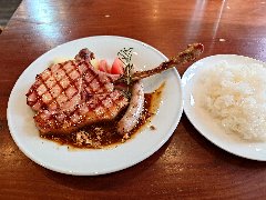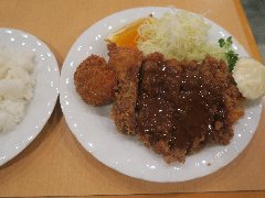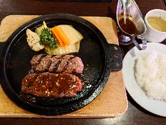 レストランゆざわ | 洋食 | 新潟県南魚沼郡湯沢町大字湯沢 | ★ (2016.2.21) | 普通 | ![]() | 越後湯沢駅東口から1分、ロータリーの目の前にあります。外にはショーケースにはメニューサンプルが並んでいます。店内は、テーブルが多数ありました。漫画が大量に並んでいます。レトロ感が漂います。ポークカツレツ(1080円)+Aセット(580円)を注文しました。Aセットにはライス、ミニサラダ、コーヒーが付きます。カツレツは越後もち豚を使っているそうです。熱々の鉄板で出されドミグラスソースが掛かっています。柔らかくて美味しかったです。ジャガイモ、人参、インゲンが添えられていました。他には、ステーキ、ハンバーグ、スパゲッティ、カレーなどいろいろありました。 |