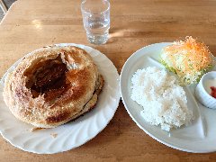 ![]() | 二本松駅から10kmほど、県道30号沿い、岳温泉街にあります。3階建てのロッジ風、大きな三角屋根です。店内はテーブルが4つありました。電話ボックスがあったり昭和な雰囲気です。山のハンバーグシチュー(1430円)を注文しました。ライス、サラダ、ヨーグルトが付きます。大きな器はパイ生地に覆われていました。サクサクと破ると中はデミソースのシチューです。シチューには、ハンバーグ、じゃがいも、人参、マッシュルーム、いんげんなどが入っていました。濃厚で旨味がたっぷりでした。器の周りのパイは全部食べられますがお腹いっぱいになります。美味しかったです。他には、高原の完熟トマトシチュー、森のビーフシチュー、ビーフデミグラタンなどがありました。 |