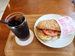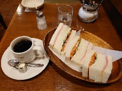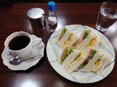 ![]() | 御殿場駅富士山口から1、2分、県道153号沿いにあります。4階建ての建物の1階です。外に紫陽花がいっぱい咲いていました。店内は、カウンター席が3つ、テーブルが多数ありました。やや薄暗いく落ち着いた雰囲気です。ブレンドコーヒー(400円)とミックスサンド(520円)を注文しました。コーヒーはやや酸味があるタイプでした。サンドウィッチは、ハムチーズとトマトキュウリの2種類でした。まさに王道ミックスサンド、ハムは2枚、野菜は瑞々しかったです。美味しかったです。他には、各種ドリンク、カスタードプリン、各種パフェ、トーストなどがありました。朝8時からの営業です。 |