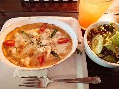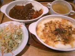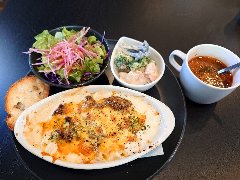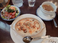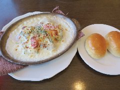 ![]() | 清里駅から2、3分、駅から近いです。洋風な大きな建物です。グラタンと大きく書かれていました。お店は2階です。店内は、テーブルが多数ありました。広々とした配置です。窓が大きくて明るくきれいです。窓からは八ヶ岳が見えます。地もの野菜とソーセージのグラタン(1375円)とパン(220円)を注文しました。ミニサラダが付きます。熱々のグラタン皿で出されます。ソーセージ、カボチャ、ズッキーニなどが入っていました。ホワイトソースは地元の牛乳から作るそうです。美味しかったです。でもお皿は浅く量的には物足りなかったです。因みにマカロニは入っていません。他には、きのこドリア、甲州鶏のマカロニグラタン、グラタン風ほうとうなどがありました。 |