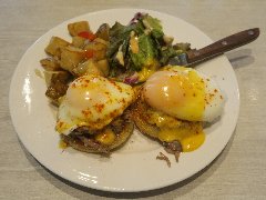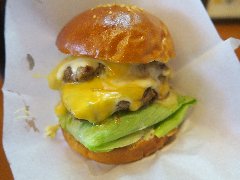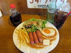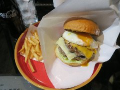 ムーンカフェ | 洋食 | 神奈川県横浜市中区本牧宮原 | ★ (2014.12.28) | 普通 | ![]() | 一番近い駅は山手駅だと思いますが遠いです。山手警察署前の交差点の近くにあります。目をかたどった黄色いトレードマークが目印です。お店の外にはカスタムバイクなどを展示してます。店内はカウンター席が8つ、黄色いボックスシートが4つありました。60年代のオールドアメリカンな凝った内装のきれいなお店です。店の外にもテーブルがあります。間違えた、ディーンムーン(1296円)+チーズ(162円)+サニーサイド(目玉焼き)(162円)と生ビール(648円)を注文しました。出てきてびっくり、大きなパティが2枚入ってます。変だと思ってメニューを見ると、注文したと思っていたのはディーンムーンJr.(1296円)で、Jr.が無いとパティ2枚のディーンムーン(1944円)となります。まあ、いいか。上からピクルス、オニオン、トマト、レタス、サニーサイド、チーズ、パティx2が挟まります。かなり分厚くなります。パティは1つでも十分大きいです。ポテトも山盛りなので全体としてすごいボリュームです。他には、ロコモコやステーキなどもあります。 |