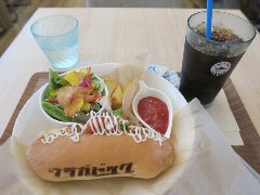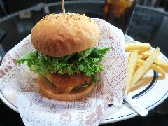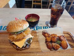 CAFE& | ハンバーガー | 静岡県下田市外ヶ岡 | ★ (2016.5.20) | 普通 | ![]() | 伊豆急下田駅から10分ほど、国道135号沿いにある道の駅開国下田みなとの中にあります。コンクリート打ちっ放しの壁の新しい建物です。店内は、外向きのカウンター席が6つ、テーブルが5つありました。天井がとても高く、窓が大きくて明るいです。海っぽい装飾が多いです。金目鯛を使ったご当地バーガー、下田バーガー(1000円)を注文しました。金目鯛のフライ、カマンベールチーズ、チェダーチーズ、レタス、トマト、照り焼きソースがサンドされていました。金目鯛フライが揚げ立てで、少し魚独特な香りがしました。サイズがけっこう大きくてボリュームがあります。ポテトチップが付きます。他には、チキンクランチバーガー、生ハムアンドクリームチーズバーガー、ダブルメンチバーガーなどがありました。 |