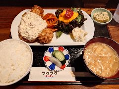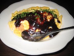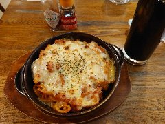 ゴチソウ家 | 洋食 | 滋賀県近江八幡市堀上町 | ★ (2015.10.7) | 小高 | ![]() | 近江八幡駅北口から西に10分ほど、県道48号から路地に入ったところにあります。洋風の居酒屋です。店内は、カウンター席が9つ、テーブルが3つ、個室が1つありました。2階の席もあるようです。オムライス(ケチャップ&マヨネーズ)(1491円)、唐揚げ人民風(746円)などを注文しました。オムライスは、いわゆるタンポポオムライス風でオムレツの真ん中を割ると中はトロトロです。美味しいです。でもちょっと高いです。その他、各種おつまみ、パスタやピザもありました。 |