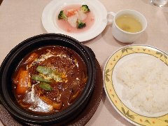 ![]() | 来宮駅から1.2kmほど、熱海所記念病院の前にあります。ビルの1階です。白い暖簾、ガラス戸の外観です。店内は、カウンター席が3つ(使ってない?)、テーブルが1つ、小上がりのテーブルが3つありました。和風で昔ながらの雰囲気です。ポークソティー定食(1500円)を注文しました。ご飯、味噌汁、漬物、パイナップルが付いていました。ポークソティ゙ーはやや生っぽい玉ねぎとデミソースが掛かります。肉は分厚くて柔らかく食べ応えがありました。玉子焼きや果物が付くのも嬉しいです。美味しかったです。他には、スペシャルランチ、ヒレカツ、オムライスなどがありました。 |