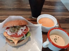![]() | 藤田駅から12、3分、国道4号沿い、道の駅「国見あつかしの郷」の中にあります。あつかしとは国見町にある阿津賀志山の事だそうです。新しい大きな施設です。店内は、テーブルが多数ありました。レジで注文して無線で呼び出しが掛かるセルフサービスです。国見バーガーのクラシック(さば味噌)(450円)とチーズ入りチキンソースカツ(450円)ともものジェラート(250円)を注文しました。クラシックにはさば味噌、トマト、レタス、チキンソースカツにはチキンと刻みキャベツが入っていました。意外とさば味噌バーガーもありです。どちらも濃い味系なのでジェラートでさっぱりします。美味しかったです。その他のハンバーガーは、あつコロ(あつかしコロッケ)、フルーツがありました。国見らーめんもありました。ジェラートは酒かす、ヨーグルトなどがありました。 |