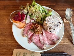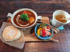 ![]() | 芦川駅から1分、県道36号沿いにあります。目指していないと見過ごしそうです。白壁の外観、よく見るとプレハブの建物です。店内は、カウンター席、テーブルがいくつかありました。全部違う机と椅子、ピアノやギター、古いミシンなど置かれ古民家風、お洒落感があります。小物も売られていました。ビーフシチューとお芋マフィン(1540)といつものコーヒーとチョコとフランボワーズ(料理と合わせて2100円でした)を注文しました。コンソメスープとピクルスが付きます。シチューにはブロッコリー、人参、ジャガイモ、牛肉が入っていました。牛肉は甲州牛スネ肉、牛肉も野菜も大きめで柔らかかったです。コーヒーは深煎りでクッキー付き。ケーキは濃厚でアイスが添えらます。美味しかったです。特にアイスが独特の美味しさがありました。他には、各種ドリンク、ライスパトラ、ホットサンド、クリームあんみつなどがありました。常連さんとの会話も楽しかったです。 |