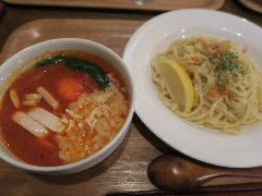 アドニス | 洋食 | 静岡県富士市吉原 | ★ (2015.11.28) | 小高 | ![]() | 吉原本町駅から6、7分、吉原商店街にあります。喫茶店のようでもあり洋食屋のようでもあります。店内は、テーブルが多数ありました。元祖つけナポリタンのお店です。つけナポリタンは吉原商店街で食べられるB級グルメで、TVの企画から生まれたようです。つけナポリタン(つけ富士リタン)(1200円)を注文しました。つけ汁側に味玉、蒸し鶏、チンゲン菜、チーズ、麺側に桜エビ、レモンが乗っていました。麺は太麺、パスタのようなラーメンのような麺で仕上げに桜エビと炒めるそうです。スープは、トマト、鶏がらなどで作るそうです。トマトソース好きには嬉しいです。美味しいですがちょっとしょっぱかったです。つけナポリタンと言うよりはトマトつけ麺といった感じでした。〆のご飯もありました。他には、洋食メニュー、ピザやパスタ、デザートなども充実しています。 |