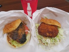 沼津バーガー | ハンバーガー | 静岡県沼津市千本港町 | ★ (2015.3.28) | 普通 | ![]() | 沼津駅から2km強、沼津港の近くの飲食店街にあります。真新しい建物に大きく沼津バーガーと書かれています。店内は、ファーストフード店そのものでテーブルが並んでいます。マグロバーガー(480円)とイカタコナゲット(380円)を注文しました。マグロバーガーはマグロのパティ、レタス、トマト、刻み玉ねぎが入っていました。普通に美味しいですがマグロ感はほとんどありません。イカタコナゲットは一般的なナゲットではなく練り物を揚げたもので、さつま揚げっぽいです。他には、深海魚バーガー、あじフライバーガー、みしまコロッケバーガーなどがありました。 |