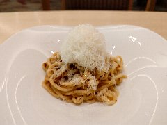 ![]() | 下部温泉駅から2分ほど、下部ホテルの1階、大きなホテルです。広いラウンジで営業しています。店内は、テーブルが多数ありました。ゆったりした雰囲気、大きな窓からは庭が見えます。富士山チーズボロネーゼS(1100円)を注文しました。太い生パスタの上に、ふわふわなチーズが山盛りになっていました。パスタは温泉水で茹でるそうです。ゴロゴロした挽肉が入っていいました。美味しかったです。富士山という感じはしませんでした。他には、樹海チーズボロネーゼ、毛無山ボロネーゼなどがありました。パスタの量はSサイズは180g、Mサイズは360gでその間が欲しいですね。 |