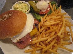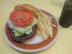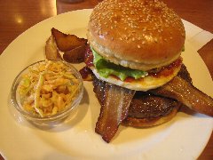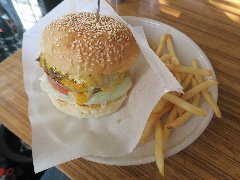 サニーダイナー | ハンバーガー | 東京都足立区千住 | ★ (2015.2.28) | 普通 | ![]() | 北千住駅西口から4、5分、住宅街にあります。外観は、白い壁に赤い扉で目立ちます。店内は、カウンター席が5つ、テーブルが2つありました。明るくて派手で賑やかな感じです。店員さんは女性2人でした。ベーコンエッグチーズバーガー(1490円)とコーラ(162円、ランチドリンク)を注文しました。コールスロー(甘め)と大量のポテトが付きます。パティ、ベーコン、目玉焼き、チーズがバンズに挟まれています。レタス、トマト、刻み玉ネギ、ピクルスは別に置かれています。柔らかめのバンズで全部挟みます。パティは100%牛肉で、ちょっとしょっぱかったです。コーラのグラスが異様に大きく、飲みきれなかったです。その他、各種ビーフハンバーガー、チキンバーガー、フィッシュバーガー、サンドウィッチなどがありました。店員さんは丁寧です。デリバリーも行っているようです。 |