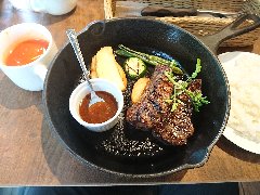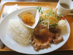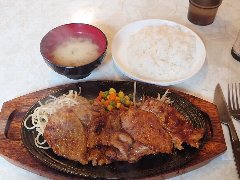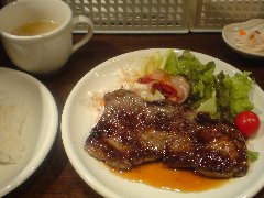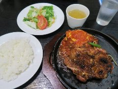![]() | 高島平駅西口から6、7分、都道446号沿い、赤塚公園の向かいにあります。3階建ての1階です。ネオン管の看板が出ています。店内は、カウンター性が9つ、テーブルが多数ありました。けっこう広くて席の配置がゆったりしています。アメリカンな雰囲気、ややファミレス感があります。ポークソテー和風ソース(1000円)のÀセット(400円)を注文しました。セットはライスかパンとドリンクです。ポークソテーにはきのこの醤油系ソースが掛かっていました。柔らかい豚肉とソースがよく合います。美味しかったです。他には、ハンバーグチーズ焼き、サーロインステーキ、有頭エビフライなどがありました。 |
