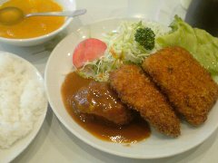 キッチン大正軒 | 洋食 | 東京都千代田区有楽町 | ★★ (2015.3.7) | 普通 | ![]() | 有楽町駅の駅前にある東京交通会館の地下にあります。大正3年創業の肉屋直営、東京交通会館が落成した昭和38年から出店しているそうです。店内は、カウンター席が9つ、テーブルが1つありました。結構狭いです。メニューはかなり多くて迷います。組合せ定食から、煮込みハンバーグとひれかつ(1050円)を注文しました。煮込みハンバーグは柔らかいです。油はキャノーラ油(菜種油)を使用しているそうです。付け合せはキャベツとナポリタンです。ボリュームがあります。他には、豚しょうが焼き、カレー、カラメン定食(唐揚げとメンチ)、スコッチエッグ定食などいろいろありました。 |