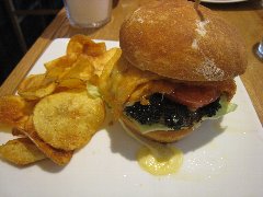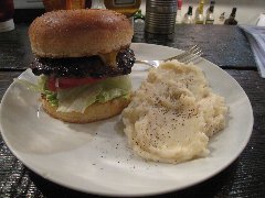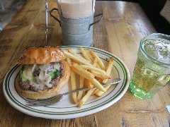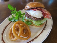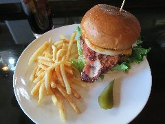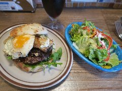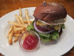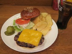 ![]() | 大江戸線の豊島園駅から1分、豊島園通りの豊島園前交番交差点に近くにあります。マンションの1階です。黒い看板とガラス戸の外観です。店内は、テーブルが6つありました。オールドアメリカンな装飾、ウッディでお洒落感があります。マッシュルームチーズバーガーセット(1630円)を注文しました。フレンチフライとドリンクが付きます。ジンジャーエールにしました。サンドされるものを選べ、オリジナルにしました。ハンバーガーは、チーズ、マッシュルーム、タルタル、玉ねぎ、ブロッコリー、パティなどがサンドされていました。パティは粗挽きの牛肉、肉々しくて肉汁も出てきて旨味があります。美味しかったです。他には、ベーコンチーズバーガー、チリチーズバーガーなどがありました。 |