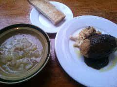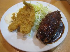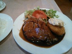 シュベスター | 洋食 | 東京都板橋区板橋 | ★ (2012.7.6) | 小安 | ![]() | 下板橋駅から下板橋通りを北に進むとあります。街中の洋食屋さんです。店内はテーブルが4つだけでこじんまりしています。特製日替りランチ(680円)を食べました。金曜日は、1プレートでハンバーグ、ポークカツ、クリームコロッケ、サラダ(キャベツ、レタス。トマト)が乗っています。それとスープとライスが付きます。ボリューム満点で美味しいです。他にはカレー、パスタ、フライ、肉料理などメニューは豊富です。そして安いです。家の近くに欲しいお店ですね。 |