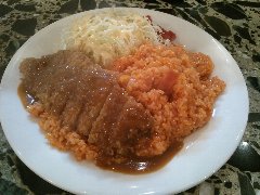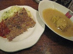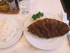 ポンチ軒 | 洋食 | 東京都千代田区神田小川町 | ★★ (2013.3.23) | 普通 | ![]() | 小川町駅の近く、靖国通りの一本裏の道にあります。レトロな感じの店構えです。店内は、洒落たカウンター席が7つ、レトロなテーブルが4つあります。ジャズが流れています。メニューが書かれた黒板を、店員さんが客毎に持ってきます。カツと特製カレー(1000円)を食べました。ご飯の上にカレー、トンカツ、キャベツ、福神漬けが乗っています。カレーにはひき肉が入っています。ご飯、豚汁はおかわりが1回できます。キャベツとキムチは食べ放題です。キャベツには特製オニオンドレッシングが美味しいです。他にはトンカツ、ビーフカツ、究極のヒレカツ(4200円)等がありました。店員さんは丁寧です。 |