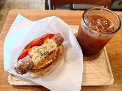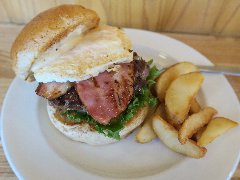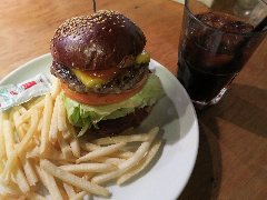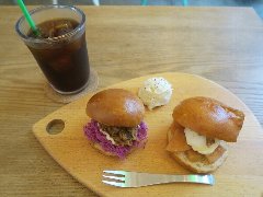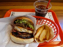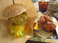 ![]() | 聖蹟桜ヶ丘駅東口から3分ほど、川崎街道沿いにあります。さくらゲートというビルの1階です。店内は、テーブルが5つ、ソファー席が2つ、外にも1つテーブルがありました。外の光が入って明るいです。ランチはハンバーガー付きのブュッフェになりますが、ハンバーガー単品でも注文できます。チーズベーコンエッグバーガー(1150円)とコーラ(300円)を注文しました。ポテトとピクルスが付きます。ハンバーガーは、ベーコン、玉子、パテ、オニオン、トマト、レタスが入っていました。パテは牛肉100%です。美味しかったです。他には、各種ハンバーガー、パンケーキ、ダッチベイビーなどがありました。ブュッフェなので人がわさわさ動くのでなんか落ち着かない感じでした。 |
